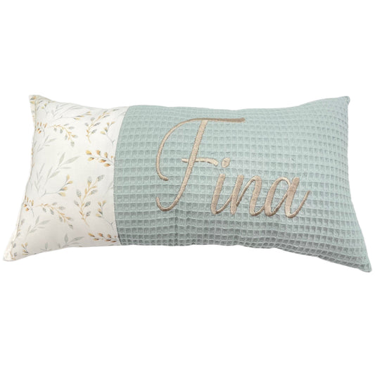 Baby Kissen mit Name, Geburtskissen, mint/ Weidekätzchen